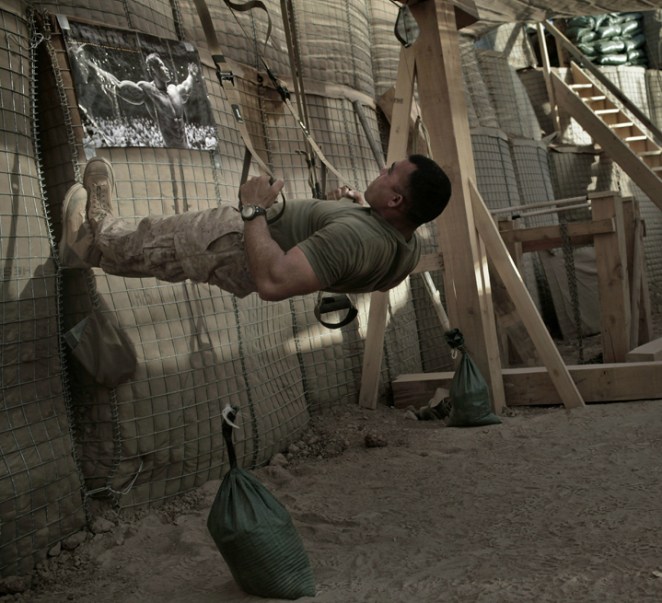 A US Marine from India Company, 3rd Battalion, 6th Marines, works out in front of an Arnold Schwarzenegger poster in southern Afghanistan. Improvised gym materials include sandbags, truck chains and ammunition cases.
